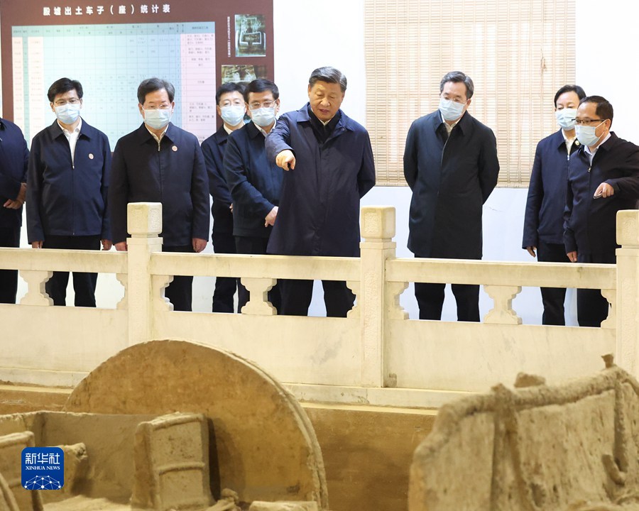 28日下午,習近平考察了位于安陽市西北郊洹河南北兩岸的殷墟遺址。殷墟是我國歷史上第一個文獻可考、為考古發掘所證實的商代晚期都城遺址。習近平步入殷墟博物館,仔細觀摩青銅器、玉器、甲骨文等出土文物。隨后,習近平來到車馬坑展廳,察看商代畜力車實物標本和道路遺跡。他指出,殷墟出土的甲骨文為我們保存3000年前的文字,把中國信史向上推進了約1000年。殷墟我向往已久,這次來是想更深地學習理解中華文明,古為今用,為更好建設中華民族現代文明提供借鑒。中國的漢文字非常了不起,中華民族的形成和發展離不開漢文字的維系。在這方面,考古事業居功至偉。考古工作要繼續重視和加強,繼續深化中華文明探源工程。中華文明源遠流長,從未中斷,塑造了我們偉大的民族,這個民族還會偉大下去的。要通過文物發掘、研究保護工作,更好地傳承優秀傳統文化。習近平強調,中華優秀傳統文化是我們黨創新理論的“根”,我們推進馬克思主義中國化時代化的根本途徑是“兩個結合”。我們要堅定文化自信,增強做中國人的自信心和自豪感。